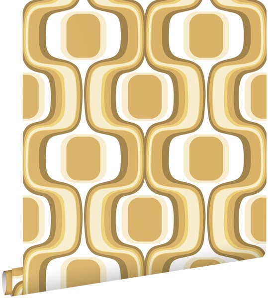 Diese Tapete mit Retro-Ornamenten in Ockergelb und Braun verleiht jedem Wohnraum den angesagten Retro-Look und lässt sich perfekt mit schönen Retro-Design Möbeln und Accessoires in bunten Farben kombinieren. Auch Zimmerpflanzen wie Sansevieria, Philodendron, Kakteen oder Hängepflanzen passen perfekt dazu und runden den Look ab.