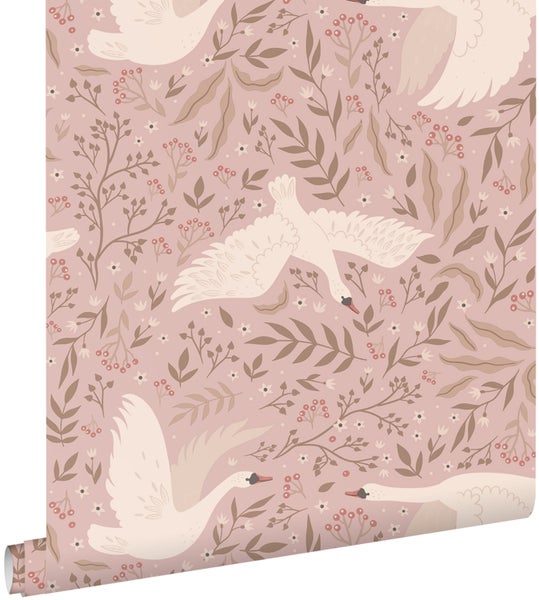 Diese schöne Tapete mit Schwänen in Altrosa sorgt in jedem Wohnraum für eine warme, romantische Atmosphäre. Sie versprüht sogar einen Hauch Nostalgie und lässt an vergangene Zeiten erinnern.