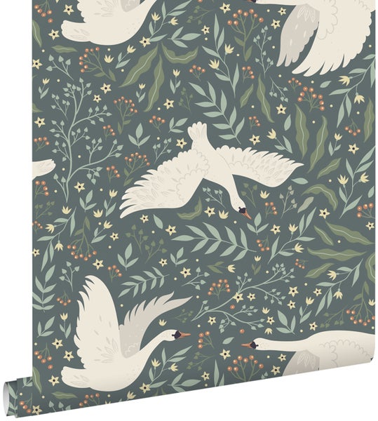 ESTAhome Tapete Schwäne Graublau und Weiß 53 cm x 10.05 m