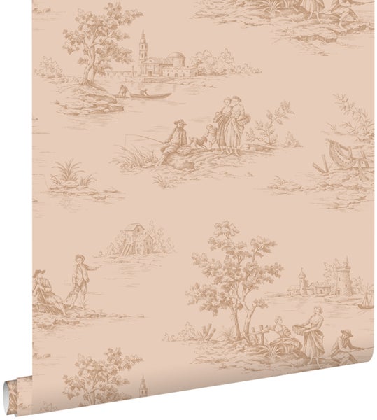 Diese schöne Tapete mit Toile de Jouy in Hellrosa verleiht jedem Wohnraum einen warmen Vintage-Look. Sie versprüht einen Hauch Nostalgie und lässt an vergangene Zeiten erinnern. Stilvolle Vintage Accessoires und Möbel passen perfekt zu dieser Tapete und runden den Look ab.