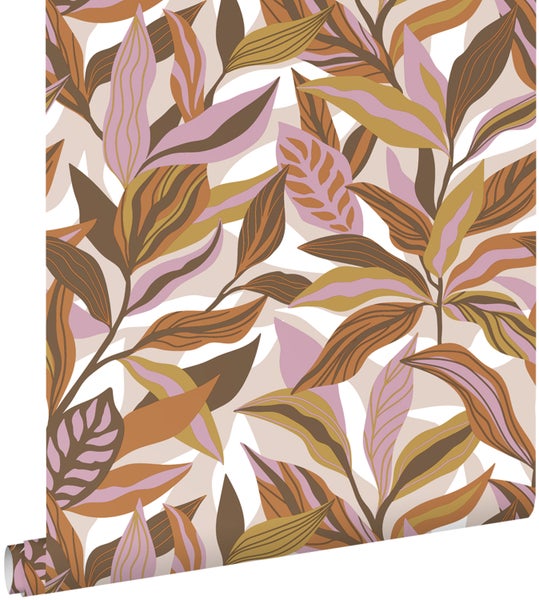 Diese trendige und farbenfrohe Tapete mit tropischen Blättern in Braun und Lila macht jede Wand zu einem echten Hingucker und sorgt das ganze Jahr über für eine sommerliche, tropische Atmosphäre.