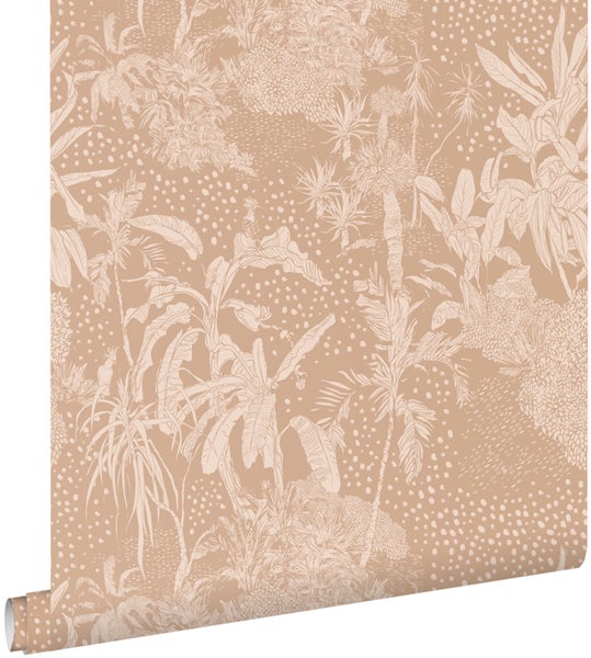 Diese trendige Tapete mit tropischen Blättern in Terrakottarosa bringt den Dschungel nach Hause und sorgt für eine lebendige, exotische Atmosphäre. Kombiniert mit vielen Pflanzen und natürlichen Materialien wird der tropisch-botanische Look komplett umgesetzt.
