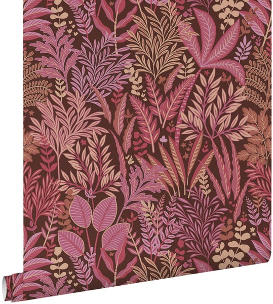 ESTAhome Tapete tropische Blätter und Blüten Aubergineviolett und Rosa 50 x 900 cm