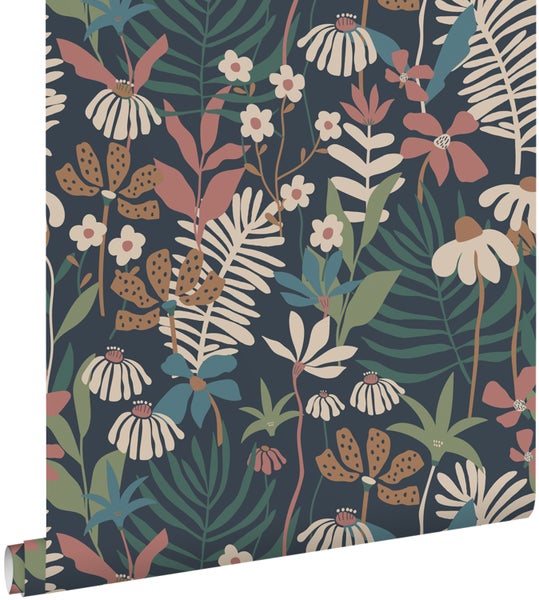 Diese trendige und farbenfrohe Tapete mit tropischen Blättern und Blüten in Dunkelblau und Mehrfarbig macht jede Wand zu einem echten Hingucker und sorgt das ganze Jahr über für eine sommerliche, tropische Atmosphäre.