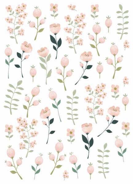Dieser Wandstickerbogen mit Blumen in Weiß, Rosa und Grün verwandelt das Kinderzimmer in ein magisches Abenteuerland. Die Aufkleber kreieren eine angenehme und freundliche Atmosphäre, die zum Spielen, Lachen und Träumen einlädt.