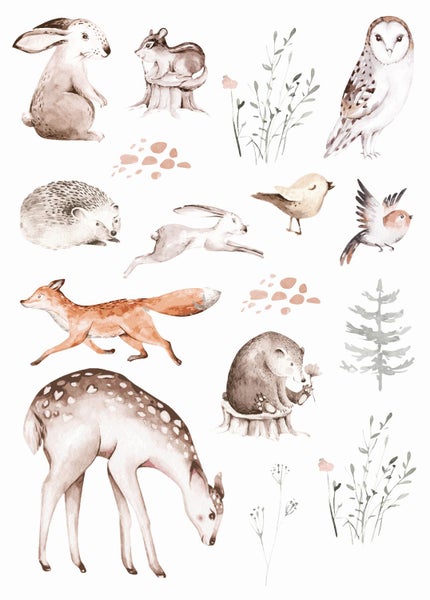 Dieser Wandstickerbogen mit Waldtieren in Braun verwandelt das Kinderzimmer in ein magisches Abenteuerland. Die Aufkleber kreieren eine angenehme und freundliche Atmosphäre, die zum Spielen, Lachen und Träumen einlädt.