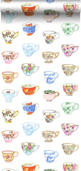 Diese schöne Tapete mit bemalten Teetassen in Mehrfarbig sorgt in jedem Wohnraum für eine warme, romantische Atmosphäre. Sie versprüht sogar einen Hauch Nostalgie und lässt an vergangene Zeiten erinnern.