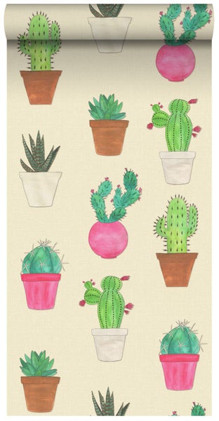 Diese schöne Tapete mit Kakteen in Grün, Rosa und Beige verleiht jedem Wohnraum einen botanischen Look. Typisch für den botanischen Stil sind satte Grüntöne, helle und frische Farben, natürliche Materialen und vor allem richtig viel Pflanzen.