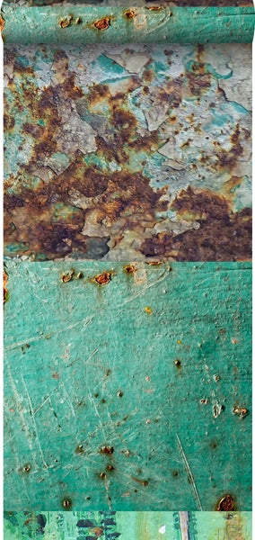 Diese trendige Tapete mit einem Patchwork von rostigen verwitterten Metallplatten in Meeresgrün und Braun verleiht jedem Wohnraum den angesagten industriellen Look und sorgt für ein angenehmes, loftartiges Ambiente.