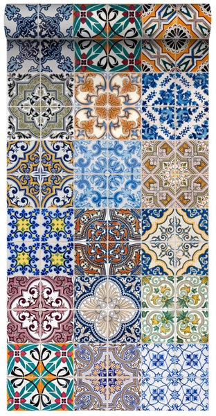 Diese schöne und trendige Tapete mit spanischen Fliesen in Blau, Orange, Grün und Beige macht jede Wand zu einem wahren Hingucker und sorgt für eine angenehme Atmosphäre.