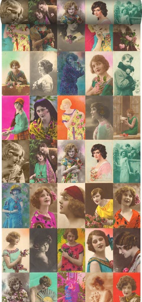 Diese schöne Tapete mit alten Postkarten mit Damengesichtern in Mehrfarbig verleiht jedem Wohnraum einen warmen Vintage-Look. Sie versprüht einen Hauch Nostalgie und lässt an vergangene Zeiten erinnern. Stilvolle Vintage Accessoires und Möbel passen perfekt zu dieser Tapete und runden den Look ab.