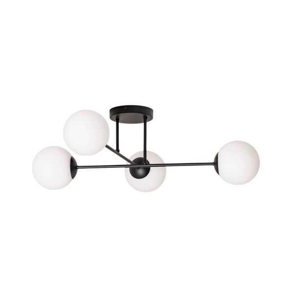 Die Deckenleuchte Glassy besteht aus einem kreisrunden Baldachin aus schwarz lackiertem Metall, an dem zwei waagerecht verlaufende und sich kreuzende Streben angebracht sind. An diesen sind je zwei Kugelleuchten aus opalweißem Glas befestigt, die rundum für eine schöne Ausleuchtung sorgen. Ideal für eine blendungsarme Allgemeinbeleuchtung. Für vier E14