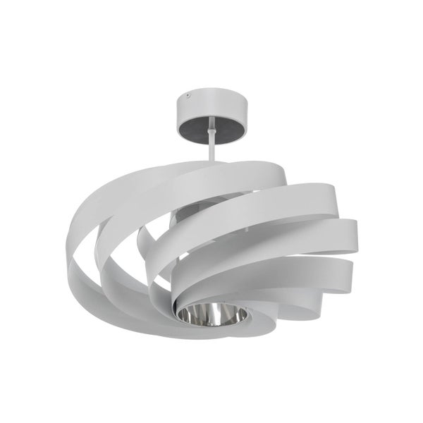 oder Schlafzimmer. Der Schirm ist aus rundherum geschwungenen, weiß lackierten Metallstreifen hergestellt. Dieser Look ist stylisch und elegant zugleich.