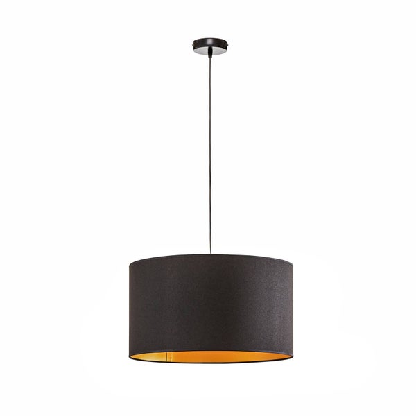 Die Hängeleuchte Roller gibt dank goldener Innenseite ein sehr warmes Licht ab, das direkt nach unten emittiert wird. Der außen schwarze Schirm besteht aus Kunstfaser