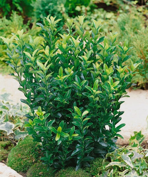 Euonymus japonicus ‘Green Spire’, der Japanische Spindelstrauch ‘Green Spire’, überzeugt als immergrüner Zierstrauch mit schlankem, säulenförmigem Aufbau und dichtem, glänzend dunkelgrünem Laub. Die elliptischen Blätter bleiben ganzjährig attraktiv und verleihen dem Garten zu jeder Jahreszeit Struktur; der jahreszeitliche Wuchs zeigt sich in frischem Austrieb im Frühjahr und besonders kompakter Blattmasse im Sommer. Die dezenten, grünlich-weißen Blüten erscheinen meist von Mai bis Juni und treten gegenüber dem eleganten Blattkleid in den Hintergrund. Als schmal aufrechter Gartenstrauch eignet sich ‘Green Spire’ hervorragend für schmale Sichtachsen, formale Beeteinfassungen und niedrige, immergrüne Hecken, ebenso als Solitär im Vorgarten oder als Kübelpflanze auf Terrasse und Balkon, wo er als buchsbaumartige Alternative für Formschnitt und Strukturpflanzung punktet.