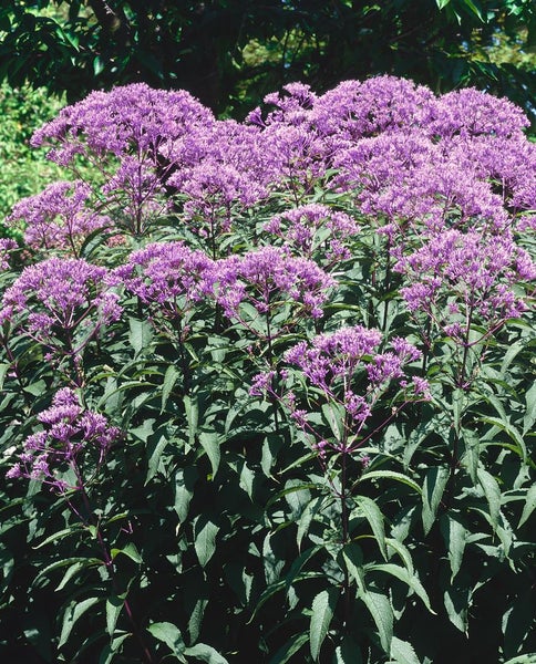 Eupatorium fistulosum ‘Baby Joe’ – Röhriger Wasserdost, auch Purpurdost genannt – ist eine kompakte, standfeste Staude, die mit purpurrosa bis violettrosanen Blütendolden von Spätsommer bis Herbst begeistert. Die reich verzweigten, stabilen Stiele tragen dichtes, lanzettliches, sattgrünes Laub und bilden einen aufrechten, buschigen Gartenstrauch-Charakter, der im Staudenbeet ebenso überzeugt wie am harmonischen Teichrand. ‘Baby Joe’ bleibt deutlich niedriger als klassische Sorten und eignet sich dadurch ideal als strukturstarke Blütenstaude für den hinteren bis mittleren Beetbereich, als Solitär im Vorgarten oder als Kübelpflanze auf Terrasse und Balkon, wo sie lange Farbe und Höhe ins Arrangement bringt.