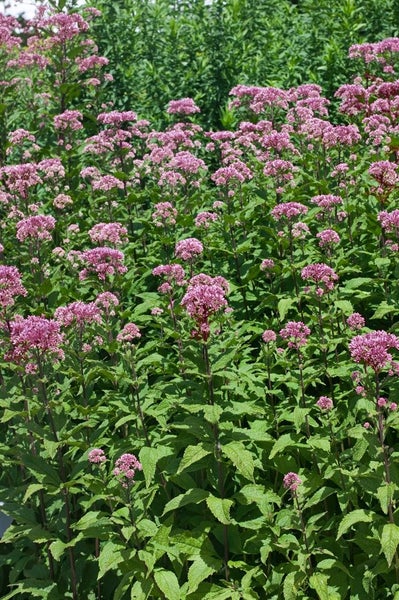 Eupatorium fistulosum ‘Purple Bush’, auch als Röhren-Wasserdost beziehungsweise unter dem botanischen Synonym Eutrochium fistulosum bekannt, ist eine ausdrucksstarke Blütenstaude für naturnahe und moderne Gartenbilder. Die Sorte bildet einen kompakten, buschigen Horst mit stabilen, aufrechten Stielen und dunkelgrünem, kräftigem Laub, das in Quirlen angeordnet ist. Von Hoch- bis Spätsommer erscheinen große, reich verzweigte Dolden aus zahllosen purpurrosa bis violetten Blütenköpfchen, die dem Beet eine elegante, schwebende Leichtigkeit verleihen und lange attraktiv bleiben. Als imposante Blütenstaude setzt ‘Purple Bush’ eindrucksvolle Akzente im Staudenbeet, im Präriegarten, am Teichrand oder in gemischten Rabatten und eignet sich sowohl als Solitär für den Vorder- bis Mittelgrund als auch für harmonische Gruppenpflanzungen. Dank der kompakten Wuchsform lässt sich die Staude zudem in größeren Gefäßen als Kübelpflanze auf Terrasse oder Balkon kultivieren, wo sie Höhe, Struktur und Farbe ins Pflanzarrangement bringt. Ein sonniger bis halbschattiger Standort mit gleichmäßig frischer bis feuchter, humoser und nährstoffreicher, dabei gut durchlässiger Gartenerde fördert einen vitalen Wuchs; Staunässe wird nicht geschätzt, kurze Trockenphasen sollten vermieden werden. Ein Rückschnitt der vertrockneten Stängel im späten Winter regt den Neuaustrieb an und hält die Pflanze kompakt. In Kombination mit Gräsern und anderen hohen Beetstauden entsteht ein langlebiger, pflegeleichter Gartenstrauß, der Struktur über die Saison liefert und den Vorgarten ebenso bereichert wie großzügige Beete.