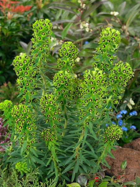Euphorbia characias ‘Blue Wonder’, die Mittelmeer-Wolfsmilch, verbindet architektonische Eleganz mit einer außergewöhnlichen Blattfärbung. Die immergrüne Staude zeigt dichte, aufrechte Triebe mit beeindruckend blau-grauen, bereiften Blättern, die ganzjährig Struktur und Ruhe in Beete und Rabatten bringen. Von April bis Juni erscheinen imposante, kerzenartig aufgebaute Blütenstände mit leuchtend chartreusefarbenen Hochblättern, die in der Frühlingssonne spektakulär schimmern und die silbrig-blaue Laubfarbe wirkungsvoll akzentuieren. Der horstige Wuchs bleibt kompakt und formstabil, wodurch ‘Blue Wonder’ als Solitär ebenso überzeugt wie in Gruppenpflanzungen, am Rand von Kies- und Steingärten oder als markante Strukturpflanze im modernen Vorgarten. Auch als Kübelpflanze auf sonniger Terrasse oder Dachgarten setzt sie mediterrane Akzente und harmoniert hervorragend mit Ziergräsern, Lavendel, Salvia und trockenheitsliebenden Stauden.