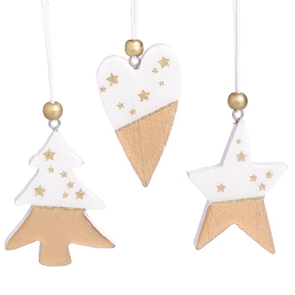Verleihen Sie Ihrer Weihnachtsdekoration einen besonderen Glanz mit diesen dekorativen Holzanhängern in Stern-, Baum- und Herzform. Die kunstvoll gestalteten Anhänger vereinen klassische Weihnachtsmotive mit einem modernen, geschmackvollen Design. Sie schaffen eine einzigartige festliche Atmosphäre und setzen elegante Akzente an Ihrem Christbaum, Tannenzweig oder Adventskranz. Die hochwertige Verarbeitung aus bemaltem Holz verleiht den Anhängern eine glatte, glänzende Oberfläche, die mit liebevollen Details wie goldfarbenen Sternakzenten verziert ist. Diese Kombination aus Materialien und Gestaltung verleiht den Anhängern eine edle und langlebige Optik, die jedes Jahr aufs Neue begeistert. Jedes Stück ist mit einem Band versehen, das durch die dekorative Holzperle harmonisch ergänzt wird, und bietet so eine einfache und stilvolle Aufhängemöglichkeit. Mit einer Größe von etwa 6,5 bis 7 cm sind die Anhänger die ideale Wahl, um Ihr Zuhause für die festliche Jahreszeit geschmackvoll zu schmücken. Ihre Vielseitigkeit ermöglicht es, sie nicht nur am Weihnachtsbaum, sondern auch als Tischdekoration, Verzierung für Geschenkverpackungen oder zur Verschönerung von Tür- oder Adventskränzen einzusetzen. Die warme Ausstrahlung des Materials und die kunstvollen Details machen diese Holzanhänger zu einem Eyecatcher in jeder Winterdekoration. Kombinieren Sie sie mit weiteren Accessoires für ein harmonisches Gesamtbild und verleihen Sie Ihrem Zuhause eine gemütliche, festliche Atmosphäre im angesagten skandinavischen Stil. Ihrer Kreativität sind keine Grenzen gesetzt – genießen Sie den Zauber der Weihnachtszeit auf ganz persönliche Weise. Entdecken Sie weitere inspirierende Dekoideen bei uns und kombinieren Sie diese wunderschönen Holzanhänger für eine rundum gelungene Festtagsdekoration. Bitte beachten Sie: Auf Produktbildern gezeigte Deko-Artikel und Zubehör sind nicht in der Lieferung inbegriffen. Maße Baum (L×B×H): ca. 6cm × 1cm × 7,5cm Maße Stern (L×B×H): ca. 5cm × 1cm × 7cm Maße Herz (L×B×H): 4,5cm × 1cm × 7cm Höhe mit Kordel: ca. 14cm Farbe: Weiß, Gold Material: Holz, lackiert, Textil Menge: 6 Stück, 3-fach sortiert Anb.Nr.: 17635 EAN: 4067555176358