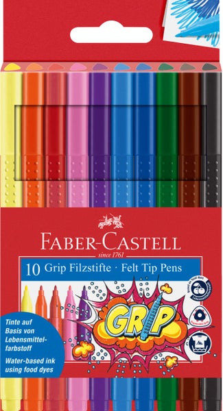 Faber-Castell GRIP ColourTitelFaber-Castell Filzstift Grip Colour Marker 10er SetErscheinungsdatum11.05.2022SpracheNicht zu entscheidenLaenge190 mmHoehe10 mmBreite105 mmEAN4005401553106