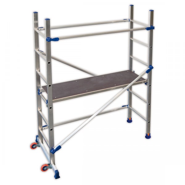 Das kompaktes Fahrgerüst P6 von Facal eignet sich ideal für Arbeiten in geringen Höhen. Das Gerüst kann schnell und problemlos in wenigen Minuten von nur einer Person aufgebaut werden. Dank den beiden Fahrrollen und dem niedrigen Eigengewicht von knapp 15 kg kann das Gerüst einfach und schnell angehoben und verstellt werden. Das 4-seitige Sicherheitsgeländer und die großen rutschfesten Standfüsse geben dem Anwender ein Maximum an Sicherheit. Das Gerüst kann auch auf Treppen und Absätzen eingesetzt werden. Die bekannte und hohe FACAL-Produktqualität geben dem Gerüst maximale Standfestigkeit Treppenverstellung: Das Gerüst kann auch auf Treppen und Absätzen eingesetzt werden aus Aluminium stabil und kompakt Treppenverstellbar mit umlaufenden Geländer schneller Aufbau durch 1 Person Arbeitsbühne mit 4 Sicherheitshaken Ausgestattet mit 2 Rollen zwei rutschfesten Füßen und Traverse