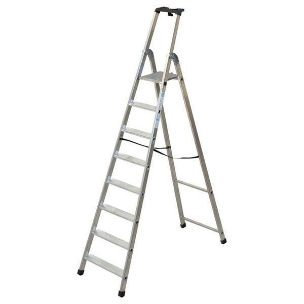 Stufenstehleiter aus Aluminium Einseitig begehbar Rutschfeste Gußplattform mit einrastbarem Brückenheber Sicherheits-Gurtbänder ab 5 Stufen Inklusive Plattform Große Werkzeugablageschale Starke Gussplattform Plattformhalterungen gleiten auf nylonbeschichteten Teilen Scharniere aus Gussaluminium mit Nylonüberzug um Abrieb an den Metallteilen zu verhindern Einrastbarer Sicherheitshaken Stufentiefe 85 mm Dreifach geweitete und gebördelte Stufen-Holm-Verbindung Große rutschfeste Gummischuhe Zwei verschiedene Neigungswinkel: 68° Aufstiegsteil (sehr bequemes und ermüdungsfreies Stehen) 75° Stützteil (ehöht die Stabilität und sie kommen näher an die Wand)
