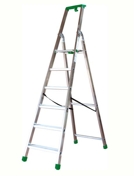 Stufenstehleiter aus Aluminium Einseitig begehbar Rutschfeste Gußplattform mit einrastbarem Brückenheber Sicherheits-Gurtbänder ab 5 Stufen Inklusive Plattform Große Werkzeugablageschale Starke Gussplattform Plattformhalterungen gleiten auf nylonbeschichteten Teilen Scharniere aus Gussaluminium mit Nylonüberzug um Abrieb an den Metallteilen zu verhindern Einrastbarer Sicherheitshaken Stufentiefe 85 mm Dreifach geweitete und gebördelte Stufen-Holm-Verbindung Große rutschfeste Gummischuhe ZUBEHÖR: 2 Klappbare Handläufe aus Aluminium. Auf Anfrage bei Facal bereits montiert