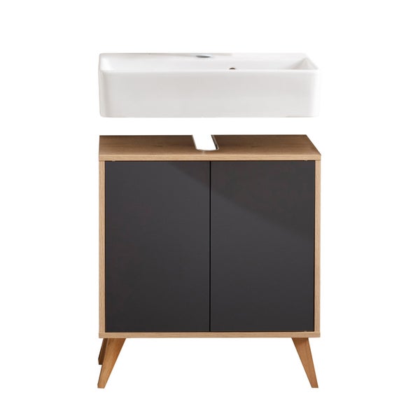 FACKELMANN FINN Badmöbel Set 3 Teile / Waschbecken / Waschbeckenunterschrank / 4 Holzfüße / Badschrank mit Push-to-Open / Korpus & Front: Schwarz / Rahmendekor & Füße: Braun hell / Breite: 60 cm