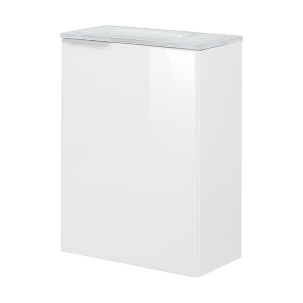 Fackelmann KARA Gäste-WC Set 3 Teile – Waschtischunterschrank mit Glasfront in Weiß mit Waschbecken aus Glas in Weiß – SBC Waschbecken beleuchtet – Türanschlag rechts – 45 cm breit