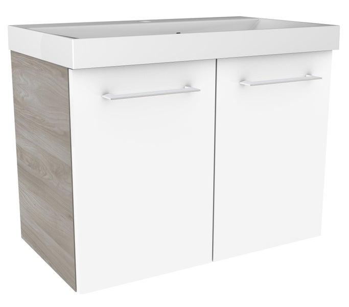 Der Waschplatz besteht aus zwei Komponenten: Der Waschtischunterschrank mit zwei Türen wird zerlegt und mit einer leicht verständlichen Montageanleitung geliefert. Korpus und Front sind aus feuchtigkeitsresistenten Materialien gefertigt, stabil und pflegeleicht. Das komfortable Waschbecken mit gerundeter Waschmulde ist aus Gussmarmor. Das Set mit einer Breite von 60 cm passt hervorragend in kleine Bäder und Gäste-WCs.
