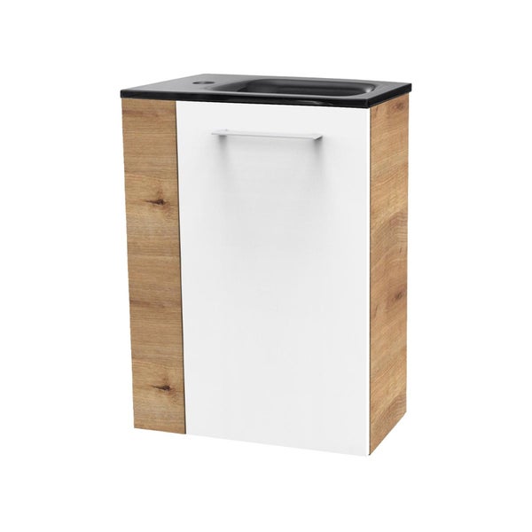 Perfekt fürs Gästebad: die Small Bathroom Collection – kurz SBC – von Fackelmann bietet eine große Auswahl an Möbeln, die speziell auf die Bedürfnisse kleiner Bäder und Gäste-WCs abgestimmt sind. Das harmonisch kombinierte Set mit 45 cm Breite besteht aus zwei Komponenten: Der Waschtischunterschrank ist in Braun hell und Weiß Hochglanz gehalten und bietet hinter einer rechts angeschlagenen Tür auf einem Einlegeboden Stauraum für wichtige Badutensilien. Dazu kombiniert wird ein Waschbecken aus Glas in der Farbe Anthrazit mit einem Platz für das Hahnloch auf der rechten oder linken Seite. Der Unterschrank wird vormontiert geliefert.