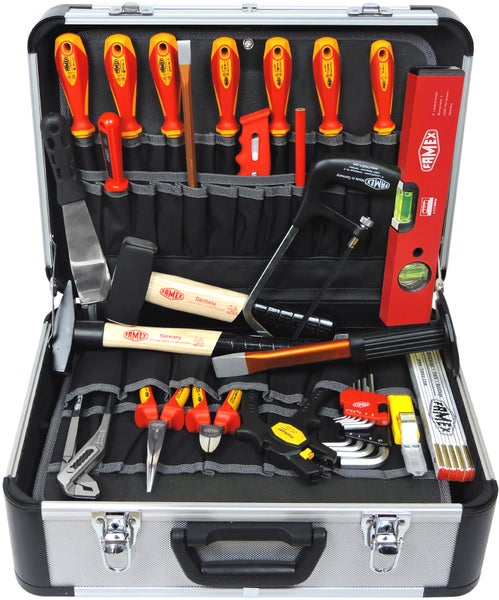 Der Famex Werkzeugkoffer 478-10 beinhaltet ein hochwertiges Werkzeugsortiment für den Elektriker. Der Großteil der Werkzeuge stammt aus deutscher Produktion. Die Werkzeuge sind für den gewerblichen Dauereinsatz oder den anspruchsvollen Anwender ausgelegt. Die Einstecktaschen sichern eine praxisgerechte schnelle Entnahme und unkompliziertes Wiedereinstecken des Werkzeugs beim Kundendiensteinsatz.