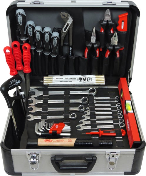 Mit dem FAMEX 729-88 Werkzeugkoffer erhalten Sie einen Werkzeugkoffer mit Grundwerkzeug-Sortiment in Top-Qualität! Viele der dort enthaltenen Werkzeuge sind aus deutscher Produktion.