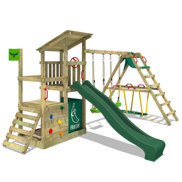 FATMOOSE Spielturm Klettergerüst FruityForest mit Schaukel Surfswing und Rutsche, Kletterturm mit Sandkasten, Leiter und Spiel-Zubehör – grün