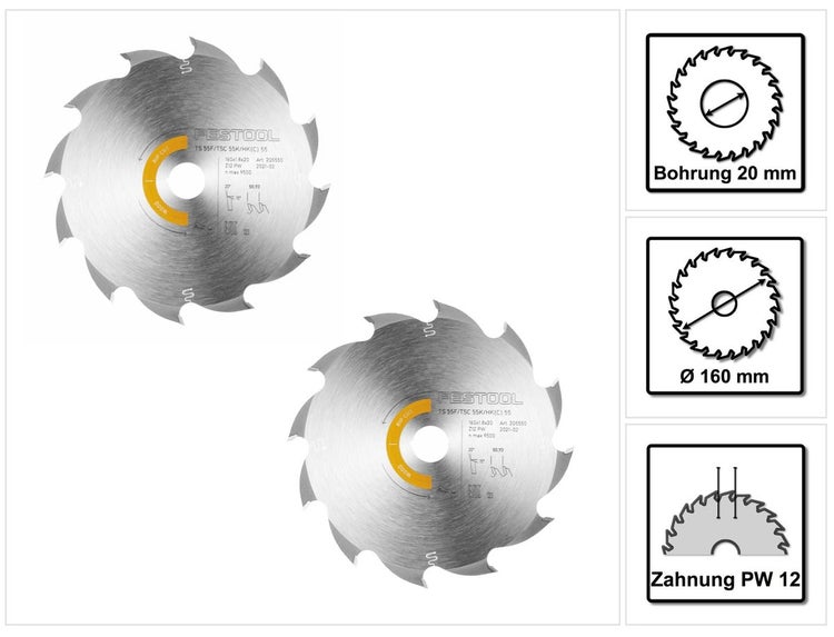 Festool 2x Kreissägeblatt Wood Rip Cut HW 160 x 1,8 x 20 mm PW12 ( 2x 205550 ) für Tauchsägen TS 55 F, TSC 55 K & Handkreissägen HK 55, HKC 55