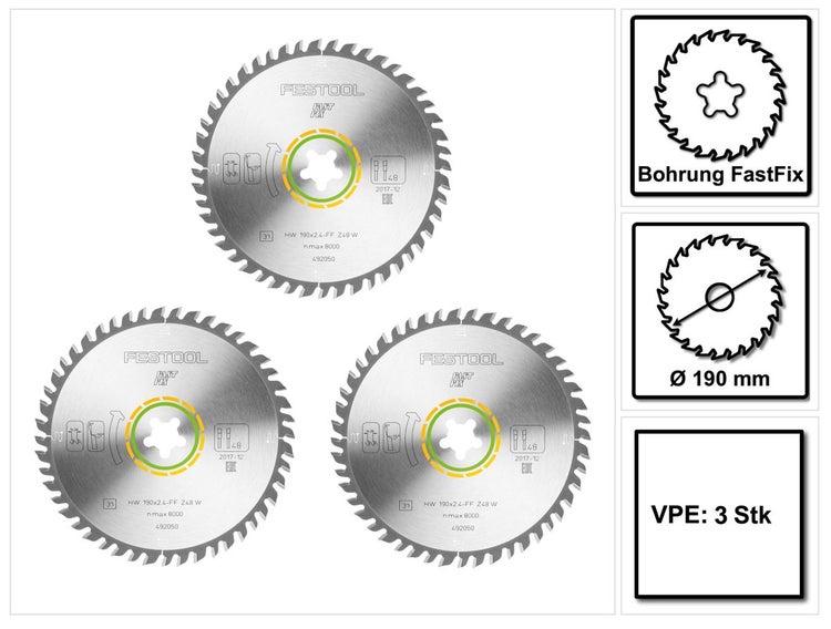 Festool 3x Feinzahn Kreissägeblatt HW 190 x 2,4 mm xFF W48 190 mm 48 Zähne FastFix ( 3x 492050 )