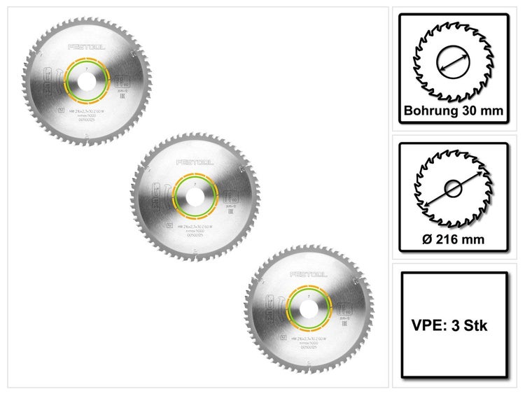 - 3x Festool Feinzahn Kreissägeblatt HW 216 x 30 x 2,3 mm W60 216 mm 60 Zähne