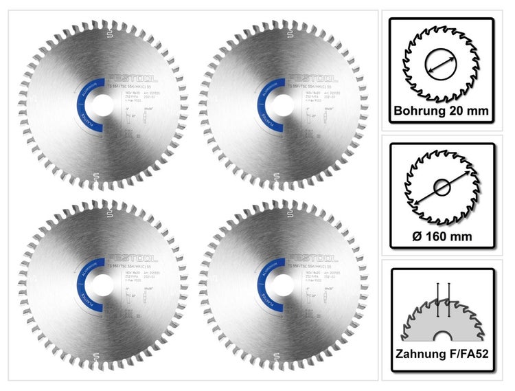 Festool 4x Kreissägeblatt Aluminium / Plastics HW 160 x 1,8 x 20 mm F/FA52 ( 4x 205555 ) für Tauchsägen TS 55 F, TSC 55 K & Handkreissägen HK 55, HKC 55