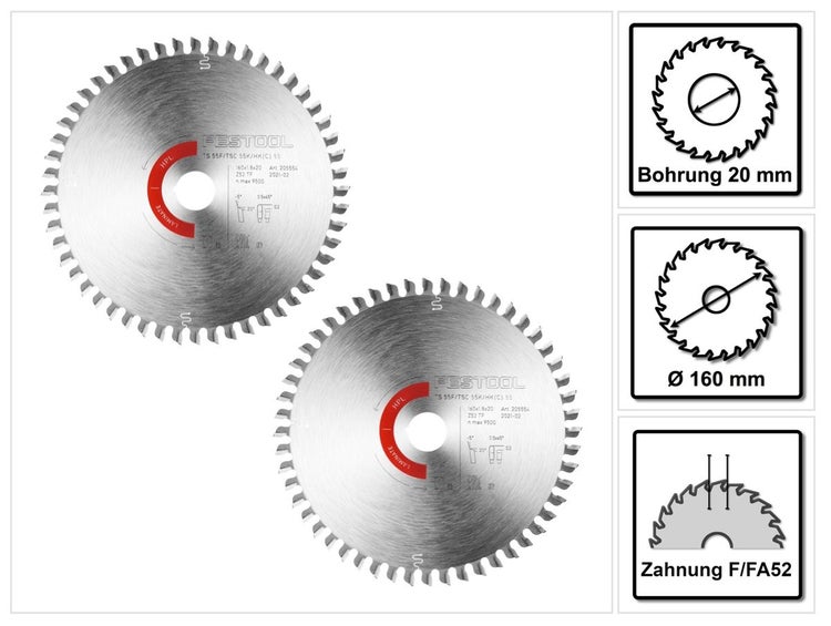 Festool Kreissägeblatt 2x Laminate/HPL HW 160 x 1,8 x 20 TF52 ( 2x 205554 ) für Tauchsägen TS 55 F, TSC 55 K & Handkreissägen HK 55, HKC 55