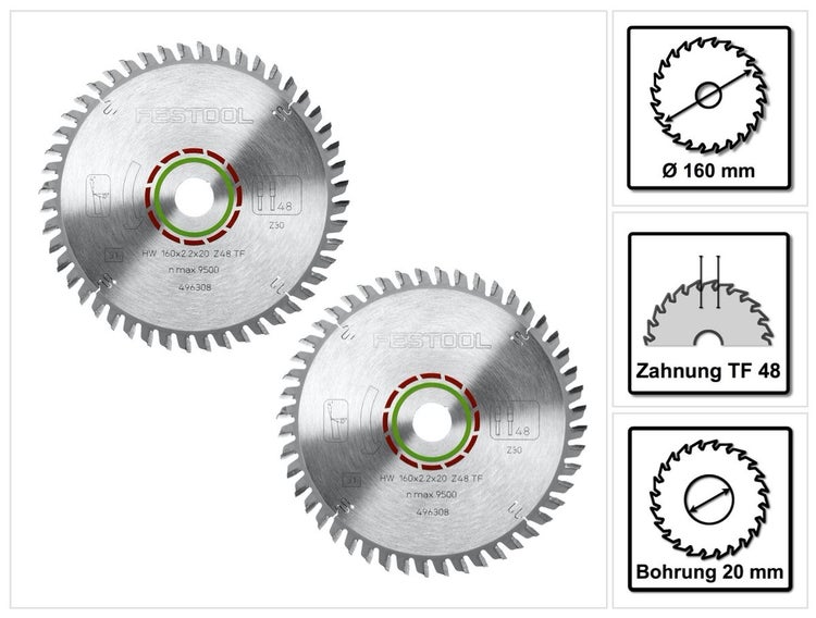 - 2x Spezial Festool Kreissägeblatt HW 160 x 2,2 x 20 mm TF48 ( 496308 )