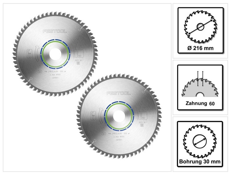 Festool Spezial Kreissägeblatt Set 2x HW 216 x 30 x 2,3 mm W60 ( 2x 491051 ) 216 mm 60 Zähne
