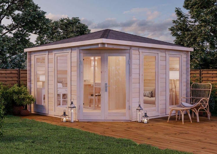 Das 5-Eck Saunahaus Maja Saunahaus macht Ihren eigenen Garten durch die eingebaute 5-Eck Innenkabine zur perfekten Wellnessoase. Den restlichen Platz der Außensauna können Sie frei gestalten und ihr Saunaerlebnis so noch entspannter machen. Die großen bodentiefen Fenster geben freien Blick in die Natur.