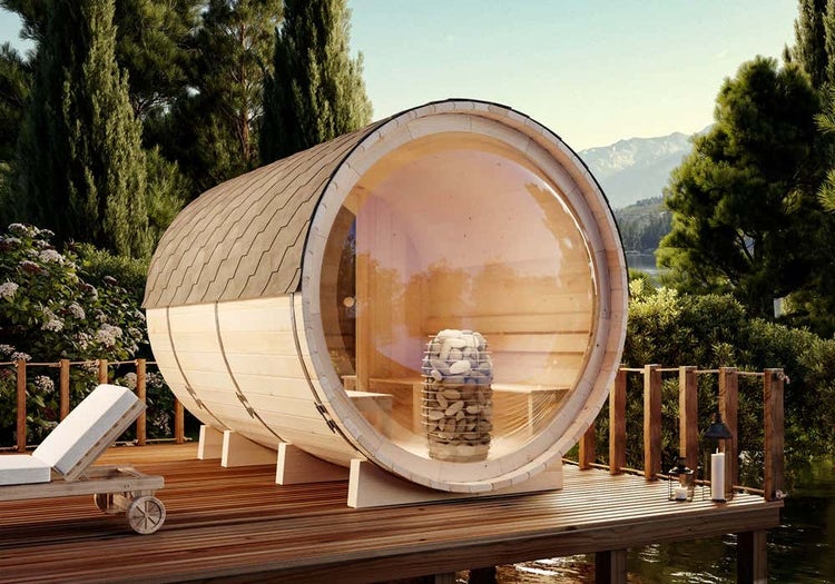 Unsere FinnTherm Comfort Set Fasssauna Panorama ist etwas ganz besonderes. Während ihre Frontansicht aussieht wie bei einem klassischen Saunafass, ist ihre Rückseite umso auffälliger, denn sie besteht komplett aus einer Glaskuppel aus Plexiglas. Dies verleiht ihr ein einzigartiges Aussehen. Sie gewinnen dadurch nicht nur eine fantastische Aussicht, sondern erhalten optisch auch von Innen mehr Platz. Die Sauna wird mit dem im Set enthaltenen Zubehör (Dacheindeckung, Saunaofen, Zubehör für den Ofen und weitere Zubehör-Utensilien) geliefert. Wir haben für Sie ein Rundum-sorglos-Paket zusammengestellt, d.h. Sie müssen sich um nichts kümmern und können schon bald die Vorzüge ihrer Sauna genießen.
