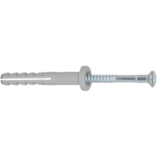 Der fischer Nageldübel N-F mit Flachkopf besteht aus einem hochwertigen Nylondübel und einer galvanisch verzinkten Nagelschraube. Diese sind für eine schnelle Montage bereits vormontiert. Der Nageldübel wird in der zeitsparenden Durchsteckmontage durch das Anbauteil eingeführt. Beim Einschlagen der Nagelschraube spreizt die Dübelhülse auf und verankert sicher im Baustoff. Der fischer Nageldübel N-F mit Flachkopf ist ideal für die Befestigung von Metallkonstruktionen in allen Baustoffen im Innenbereich. Vorteile Die schnelle Schlagmontage reduziert den Arbeitsaufwand und ermöglicht eine wirtschaftliche Serienmontage. Die integrierte Einschlagsperre vermeidet das vorzeitige Aufspreizen (Verklemmen) des Dübels und sorgt für eine problemlose Montage. Das Gewinde der Nagelschraube in Verbindung mit der Kreuzschlitzaufnahme ermöglicht das Ausdrehen der Schraube und damit eine nachträgliche Demontage. Das breite Sortiment an Durchmessern und Nutzlängen bietet den richtigen Dübel für jede Befestigung. Anwendungen Metallkonstruktionen Baustoffe Beton Kalksand-Vollstein Mauerziegel Naturstein Vollstein aus Leichtbeton Porenbeton Vollgips-Platten Hochlochziegel Kalksand-Lochstein Hohlblock aus Leichtbeton Funktionsweise Geeignet für die Durchsteckmontage. Beim Einschlagen der Nagelschraube spreizt der Dübel in zwei Richtungen auf und verankert sicher im Baustoff.