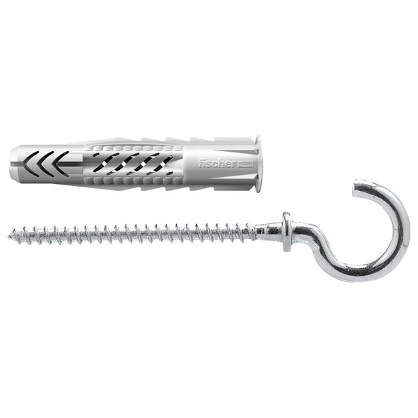 Der fischer Universaldübel UX ist ein Kunststoffdübel aus hochwertigem Nylon. Der fischer Universaldübel verspreizt in Vollbaustoffen und verknotet in Hohl- und Plattenbaustoffen für maximalen Halt. Damit ist der fischer UX immer die richtige Wahl – auch bei einem unbekannten Baustoff. Der Rand verhindert ein Tieferrutschen bei der Montage. In der Version mit Rand ist der fischer Universaldübel UX für die Vorsteckmontage geeignet. Der fischer Universaldübel UX mit Rundhaken ist beispielsweise für die Befestigung von Leuchten und abgehängten Gegenständen zu empfehlen. Vorteile Das universelle Funktionsprinzip (Verknoten oder Verspreizen) ermöglicht die Verwendung in allen Voll-, Loch- und Plattenbaustoffen. Daher ist der UX die richtige Wahl bei unbekanntem Verankerungsgrund. Die schrägen Verbindungsstege des UX sorgen für optimale Schraubenführung. Sägezahnförmige Verdrehsicherungen verhindern das Mitdrehen im Bohrloch. Dadurch wird größtmögliche Montagesicherheit gewährleistet. Befestigungssets mit Schrauben, Ösen und Haken bieten die passende Lösung für alle Anwendungen. Anwendungen Bilder Leuchten Sockelleisten Leichte Hängeschränke Handtuchhalter Spiegelschränke Gardinenschienen Waschtischbefestigungen TV-Konsolen Sanitär/Heizung/Klima-Befestigungen Baustoffe Beton Gipskarton - und Gipsfaserplatten Hochlochziegel Hohlblock aus Leichtbeton Hohldecken aus Ziegel und Beton Kalksand-Lochstein Kalksand-Vollstein Naturstein Porenbeton Spanplatten Vollgips-Platten Vollstein aus Leichtbeton Vollziegel Funktionsweise Der UX mit Rand ist geeignet für die Vorsteckmontage, der UX ohne Rand für die Durchsteckmontage. Beim Eindrehen der Schraube verspreizt der UX im Vollbaustoff und verknotet im Hohlraum. Die erforderliche Schraubenlänge ergibt sich aus Dübellänge + Anbauteildicke + 1 x Schraubendurchmesser. Geeignet für Holz- und Spanplattenschrauben sowie Stockschrauben. Bei Plattenbaustoffen darf der gewindelose Teil der Schraube nicht länger als das Anbauteil sein und es ist der UX mit Rand zu verwenden. Der Randabstand muss mindestens eine Dübellänge betragen.