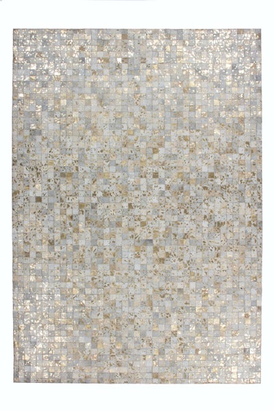 Metallische Applikationen auf echtem Leder mit weichem Haar zeichnen diesen Teppich aus. Holen Sie sich den individuellen Hingucker nach Hause und Ihre Besucher werden staunen. Basis des Lederteppichs im Patchwork-Design bilden verschiedene Nuancen eines Farbtons. Die aufgedruckte metallische Folie ist der besondere Clou des Teppichs, setzt Akzente und lässt den Teppich strahlen.