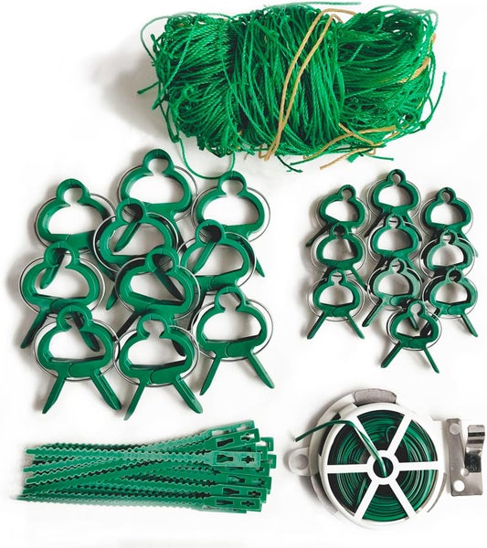 Unter den 42 Teilen, die dieses Produkt bereithält, befinden sich ein Pflanzennetz, Bindedraht auf der Spule, Pflanzenklammern (10 Stück: 30 x 40 mm/10 Stück: 40 x 60 mm) sowie Pflanzenbinder. So können Sie sicher sein, dass ihr Grün nicht umknickt und aufgrund der Rankhilfen an Gittern, Pfählen oder Ästen befestigt werden kann. Ihre Pflanzen werden es Ihnen danken.