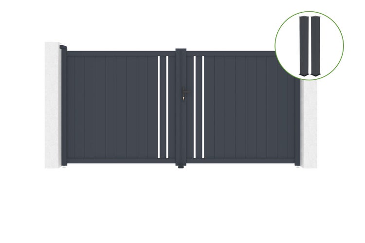 Flügeltor 3,5 m GIONA H.180 graues Aluminium + 2 Pfosten 20x20 cm H.190 cm