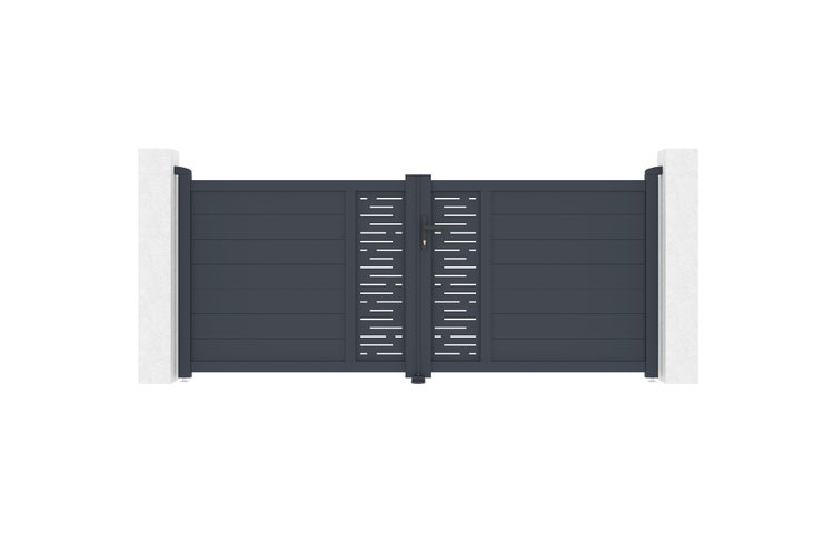 Entdecken Sie unser Aluminium-Schwenktor ARLBERG, das dank seiner Dekorplatten mit dem „Graphic Lines“-Muster die perfekte Balance zwischen Stil und Funktionalität bietet