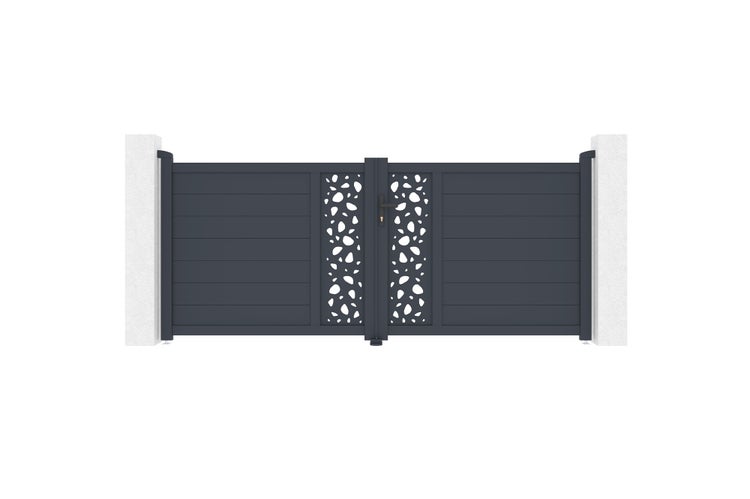 Entdecken Sie unser Flügeltor SUNNY, ein wahres Statement für Stil und Raffinesse dank seiner dekorativen Platten mit „Kiesel“-Muster, das an die Ruhe eines Zen-Gartens erinnert.